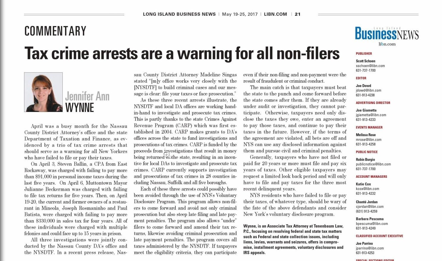 Recent Tax Crime Arrests and New York State’s Voluntary Disclosure Program
